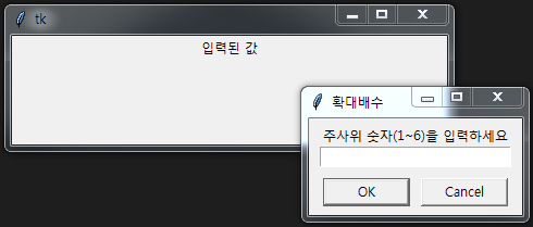 value = askinteger("확대배수", "주사위 숫자(1~6)을 입력하세요", minvalue=1, maxvalue=6)