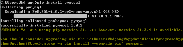파이썬 코드에서 MySQL을 사용하기 위해서는 pymysql이라는 라이브러리를 설치해야 한다. 아래와 같은 명령을 콘솔 창에 입력하면 설치가 가능하다.