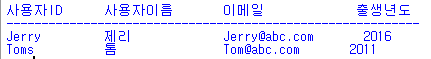 strData1.append("사용자ID"); strData2.append("사용자이름"); strData3.append("이메일"); strData4.append("출생년도")