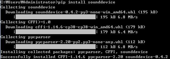 파이썬 코드에서 소리를 다루기 위해서는 scipy, sounddevice이라는 라이브러리를 설치해야 한다. 아래와 같은 명령을 콘솔 창에 입력하면 설치가 가능하다.