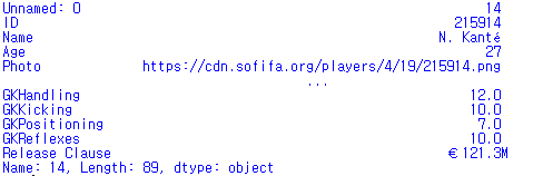 sub1 = fifa2019.loc[14] # fifa2019의 인덱스 레이블 14인 행값을 sub1에 저장