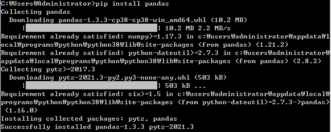 파이썬 코드에서 파일을 다루기 위해서는 pandas이라는 라이브러리를 설치해야 한다. 아래와 같은 명령을 콘솔 창에 입력하면 설치가 가능하다.