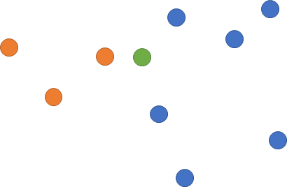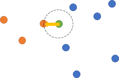 만약 K가 1인 경우, 다음 그림과 같이 새로 입력된 초록색 데이터에서 가장 가까운 거리에는 주황색 데이터가 있다. 그러므로 새로 입력된 데이터는 주황색 데이터로 분류된다.