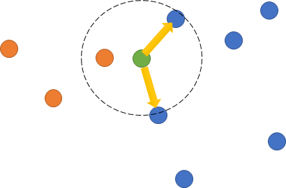 그림에서 초록색으로 표시된 새로운 데이터를 노란색으로 분류할지 파란색으로 분류할지를 결정하는 문제를 가정해 보자. K-NN 알고리즘으로 분류한다면, 입력된 데이터의 특성 공간에서 가장 가까운 거리의 데이터가 어떤 색인지 확인한다.