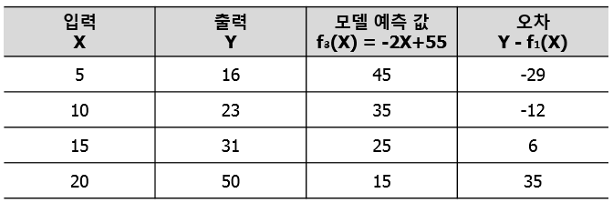 위의 표를 보면 직선은 네 점을 동시에 지나가지 않지만 꽤 근접하게 지나갈 수 있음을 예상할 수 있다. 이때, 오차들의 합을 살펴보면 1 + (-2) + (-4) + 5 = 0이 되므로, 가장 좋은 직선을 찾아내는 기준을 오차들의 합이 0이 되는 것으로 두어도 될까? 하지만 선형 회귀 모델을 f₃(X) = -2X+55로 두어도 오차들의 합은 0이 되는 것을 확인할 수 있다.