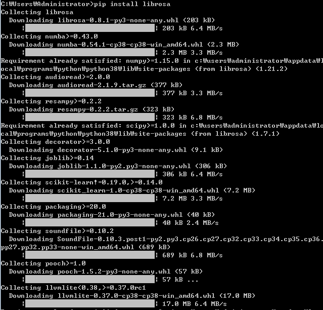 파이썬 코드에서 소리 파일을 다루기 위해서는 liblosa이라는 라이브러리를 설치해야 한다. 아래와 같은 명령을 콘솔 창에 입력하면 설치가 가능하다.