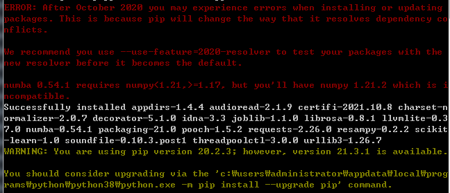 리눅스 기반에서 프로그램을 설치할 때 가끔 설치가 되지 않을 때가 있다. 그때는 install upgrade를 해야 한다. librosa 설치 시 발생하는 에러는 아래와 같다.