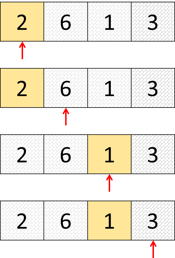1. 배열의 각 셀을 왼쪽부터 오른쪽 방향으로 확인하면서 어떤 값이 최솟값인지 결정한다. 한 셀씩 이동하면서 현재까지 가장 작은 값을 변수에 저장한다. 변수에 들어 있는 값보다 작은 값이 들어 있는 셀을 만나면 변수가 새 인덱스를 가리키도록 값을 대체한다.