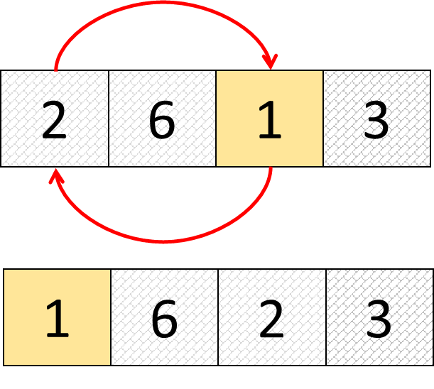 2. 이제 최솟값이 어느 인덱스에 들어 있는지 알았으므로 그 인덱스의 값과 패스스루를 처음 시작했을 때의 값을 교환한다. 패스스루를 시작했을 때 인덱스는 첫 패스스루에서 인덱스 0일 것이고, 두 번째 패스스루에서는 인덱스 1일 것이다.