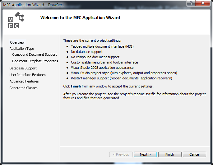 Dialog based 프로젝트가 간단한 응용프로그램을 만들기 편리하므로 Dialog based 프로젝트를 선택하고 finish를 누른다. 프로젝트가 생성되면 Dialog 하나와 프로젝트 파일들이 생성된다.