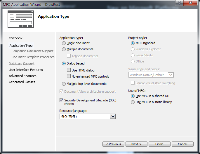 MFC Application 프로젝트는 3가지를 선택할 수 있습니다.