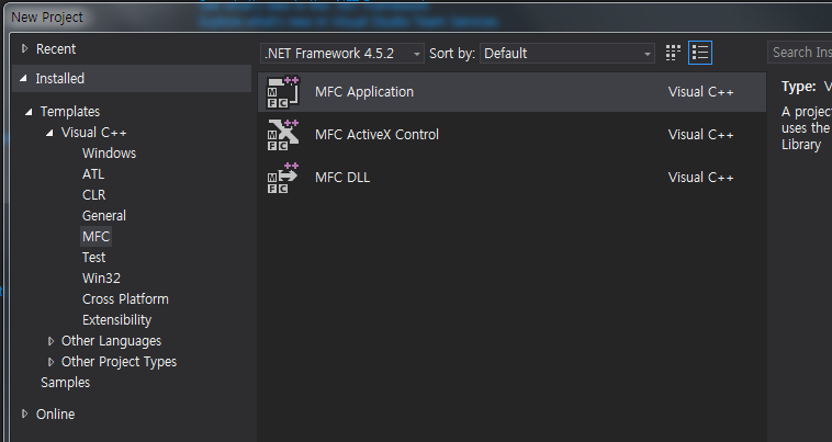 - Visual C++의 MFC 하위에 있는 'MFC Application'을 선택한다.