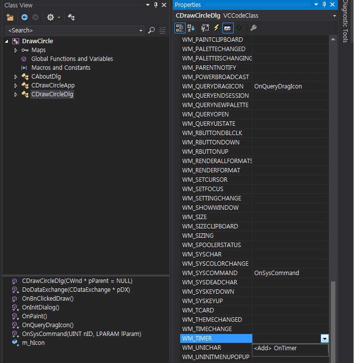 일정한 시간 간격으로 EVENT를 발생시키려면 WM_TIMER를 사용해야 한다. 클래스 뷰에서 다이얼로그를 선택 후 WM_TIMER 이벤트를 추가하자.
