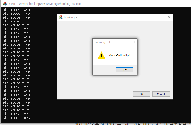 이제 마우스를 어디에서 클릭해도 해당 메시지가 뜬다. 물론 닫을 순 없다. 클릭하는 순간 또 LBUTTONUP 이벤트가 발생하기 때문이다. 이 부분은 자신에 맞게 잘 사용하자.