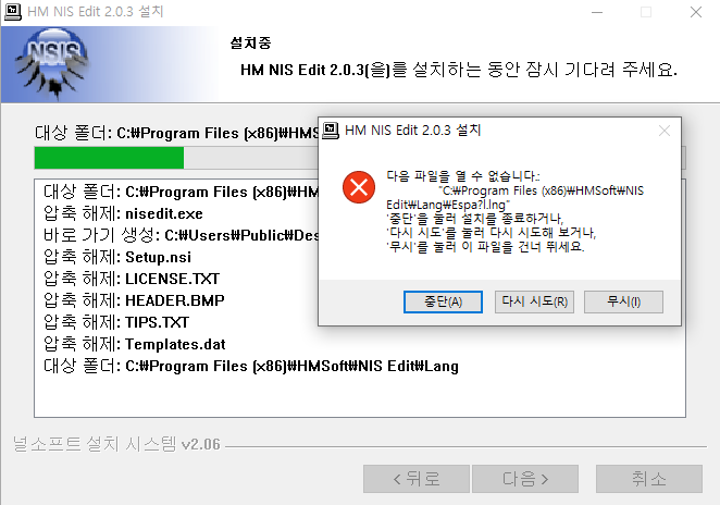 설치하다 보면 이런 에러 메시지가 뜨는데, Espa?. lng가 없다는데, 에스파냐어 안 쓸거니 '무시'.