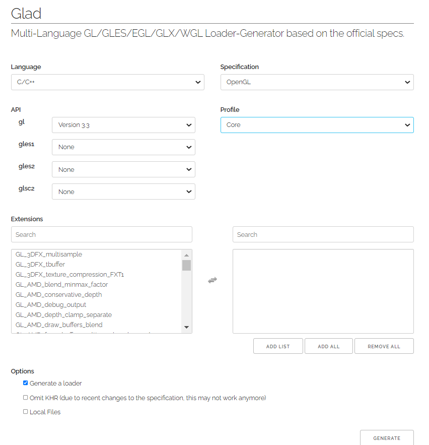 Generate를 누르면 아래와 같은 파일이 생성됨. glad.zip만 다운로드하면 된다. 압축을 해제하면 해당 파일 모두 생성된다.