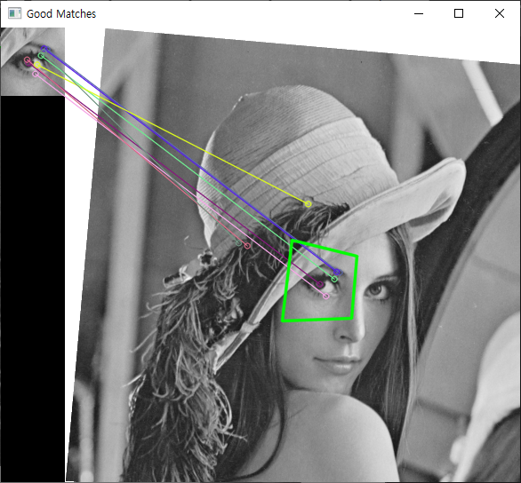 구글링을 해봐도 특징점이 제대로 잡지 못하면 그럴 수 있다고 했지만 아무리 봐도 제대로 잡은 것 같고 못 잡았더라도 너무 엉뚱한 곳을 찾아냈다. 하루를 지나 다음날 가만히 들여다보니 코드가 잘못되었다. 복붙 하다가 잘못한 건지 잘못된 예제를 따라한 건지는 잘 모르겠다. 그리고 고치니까 잘된다.