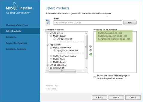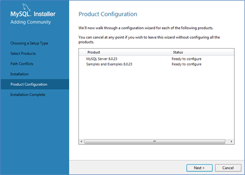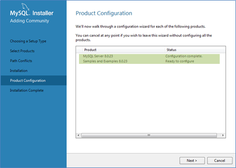 다시 [Product Configuration]이 나온다. [MySQL Server 8.0.23]은 설정이 완료되었으며, 두 번째 [Samples and Examples 8.0.23]의 설정을 할 차례다. <Next>를 클릭한다.