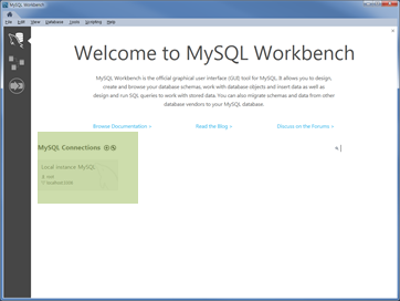 [MySQL Workbench]의 초기화면이 나온다. 아직 MySQL Server에 연결된 상태가 아니다. [MySQL Connections]에서 [Local instance MySQL]을 클릭해서 컴퓨터에 설치한 MySQL Server에 연결을 시도하자.