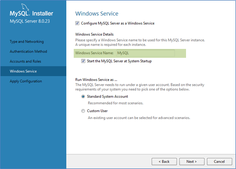 [Windows Service]는 MySQL 서버를 Windows의 서버스로 등록하기 위한 설정을 한다. [Windows Service Name]은 전통적으로 많이 사용해온 ‘MySQL’로 지정하자. 나머지는 그대로 두고 <Next>를 클릭한다.