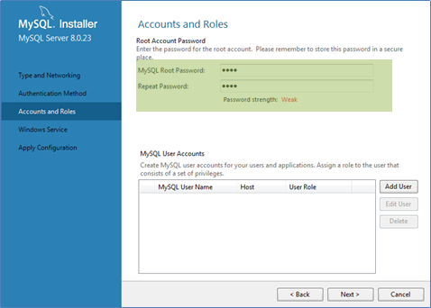 [Account and Roles]에서 MySQL 관리자(root)의 비밀번호를 지정해줘야 한다. 아래쪽의 MySQL User Accounts는 root 외의 사용자를 추가할 수 있다. 지금은 그냥 비워 두자. <Next>를 클릭한다.