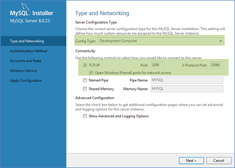 [Type and Networking]에서 [Config Type]을 ‘Development Computer’로 선택한다. 그리고 [TCP/IP]가 체크된 상태에서 포트 번호가 3306인 것을 확인하자. 그 아래 [Open Windows Firewall ports for network access]도 체크되어 있어야 한다. <Next>를 클릭해서 계속 진행하자.