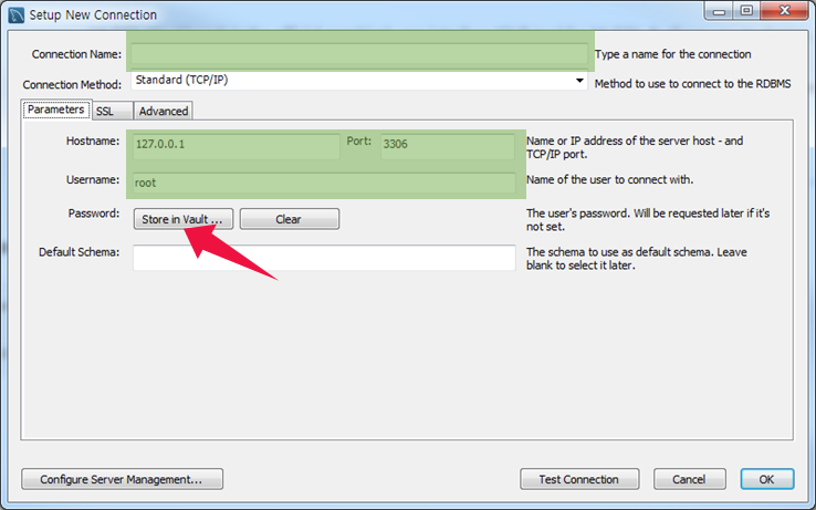 이 정도만 진행해도 되지만, 접속할 때마다 비밀번호를 작성하는 것이 귀찮다면 화살표가 가리키고 있는 'Store in Vault'를 클릭한다.