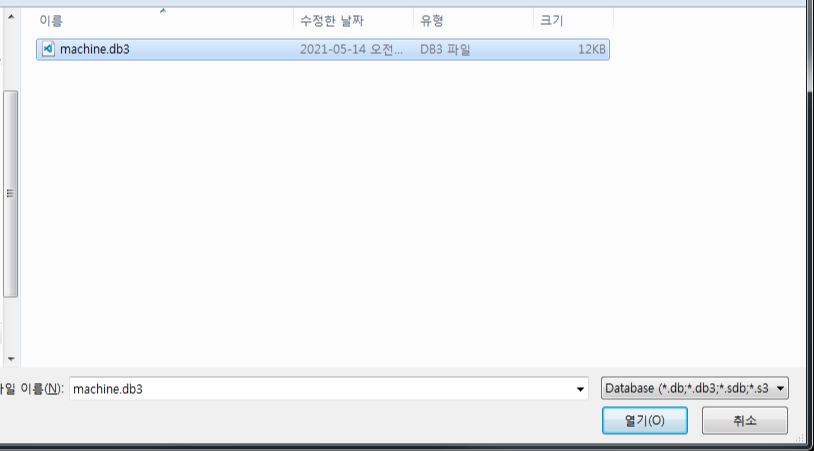 SQLite : Open Database 명령을 이용하여 db3 파일을 연다. 그냥 실행하면 안되는 경우가 많다. 해당 파일을 더블클릭해서 아래와 같은 상태와 만들고 나서 파일을 선택해 보자.