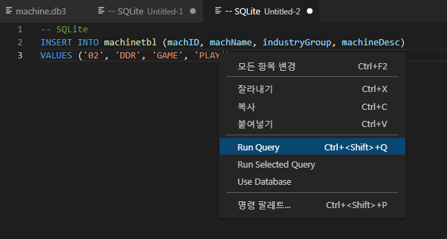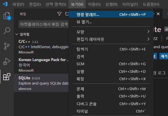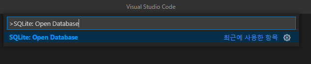 메뉴에서 명령 팔레트를 선택을 하던지, 단축키를 이용해서 열 수 있다. 자주 사용해야 하니 단축키를 외워두는 게 좋을 것 같다. 사용할 명령어는 'SQLite: Open Database'가 대부분일 것 같다.