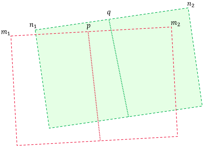중심 정렬, 2point alignment 기판의 치수 변형으로 인해 발생하는 정렬 오차를 최소화하기 위해 이를 고려한 정렬 방법이 필요하다. 중심 정렬(center alignment)은 가장 널리 사용되는 알고리즘 중 하나다. 2 point alignment 두 마크를 잇는 직선의 중심을 각각 p, q라고 하면 다음과 같이 정의할 수 있다. 정의된 중심점이 일치되도록 정렬해야 한다. p, q를 중심으로 회전할 수 있다면 간단히 계산할 수 있지만 회전은 회전 중심으로 회전하기 때문에 회전 후에 위치 이송량 dx, dy를 구해야 한다. 물론 두 직선의 각도를 구한 후 차를 구해도 된다. 회전 행렬을 이용하여 사이 각 만큼 회전을 하면 다음과 같은 모양이 된다. q' 는 다음과 같이 계산할 수 있다. 회전된 중심 q'과 기준 중심 p의 차이를 이용하.. 소프트웨어 공부/알고리즘 2023.10.31