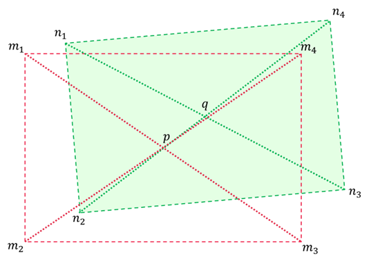 중심 정렬, 4point alignment 4 point alignment 4점 얼라인먼트는 2점과 달리 전체 면을 고르게 맞추는 방법이다. 그래서 사각형의 중심을 기준으로 얼라인먼트를 하게 된다. 두 좌표계의 중심을 p, q는 정의된 중심점이 일치되도록 정렬한다. 위치 이송량 dx, dy는 p와 q의 차이로부터 정해지며, 각도 이송량 dθ는 대각선 사이 각도의 평균으로 정한다. 소프트웨어 공부/알고리즘 2023.10.31