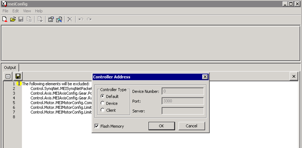 1. Upload Controller를 눌러 위 그림과 같은 창을 띄운 후, 해당 창의 Flash Memory를 체크하고 OK 버튼을 눌러 Parameter를 업로드한다. 2. 변경하고자 하는 모터의 Encorder를 선택한 뒤 기어비를 입력한다. 경로 : Controller/MotorList/Motor n/Encoder 0/Ratio A와 B의 값은 정수만 가능하며 작은 수 일수록 연산에 유리하다. 3. 화면 상단에 다운로드를 눌러 업로드 때와 동일한 창을 띄운다. Flash Memory를 체크한 후, OK 버튼을 클릭하면 저장된다. * meiConfig는 MEI 폴더 아래 응용프로그램들 모여 있는 폴더에 함께 있다.
