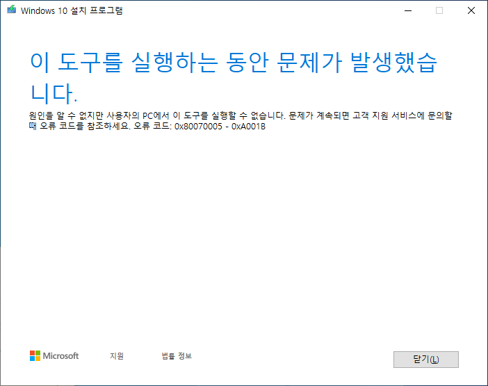 [Windows] Win10 USB 설치 이미지가 만들어지지 않을 때 Windows 10 설치 USB를 만들 때 0x80070005-0xA001B 오류로 더이상 진행이 어려운 경우가 발생한다. 이 때 컴퓨터의 Anti-Virus 프로그램이 있다면 작동을 멈추고 재시도 해보자. 경우에 따라서는 Virus 감시를 멈출 수 없는 경우가 있는데, 이 때는 어쩔 수 없이 ISO로 내려 받아서 수작업으로 부팅 USB를 만들 수 밖에 없다. 운영체제/Windows 2021.08.09